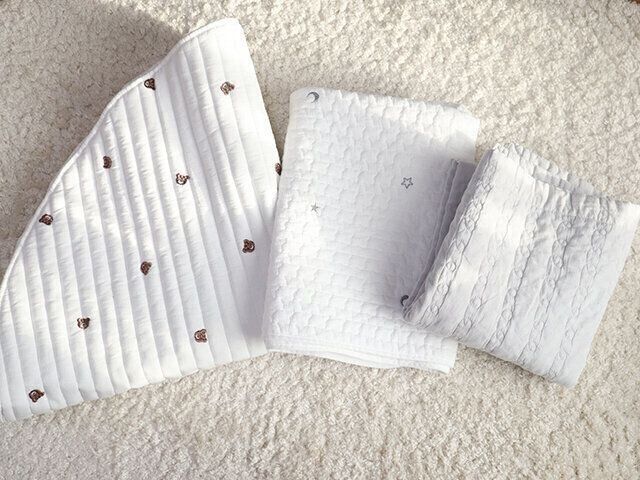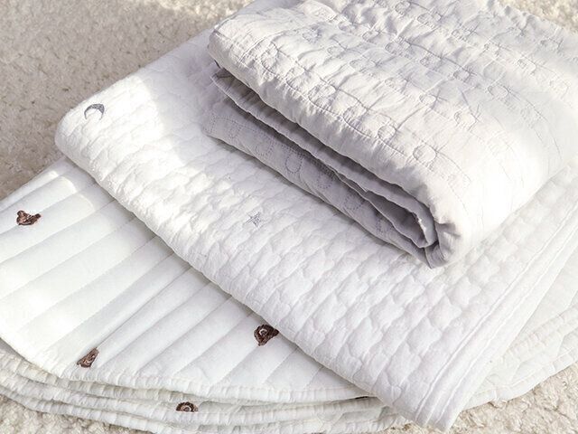 中でも重宝しているのがスリコの「キルティングマット」。マット専用なので掛け布団にはできませんが、赤ちゃんのお世話や子ども部屋に使うのにはぴったり。ほどよい厚みがあるので、お昼寝やプレイマットにも使えます。現在わが家ではこのマットの上で寝返りの特訓中!