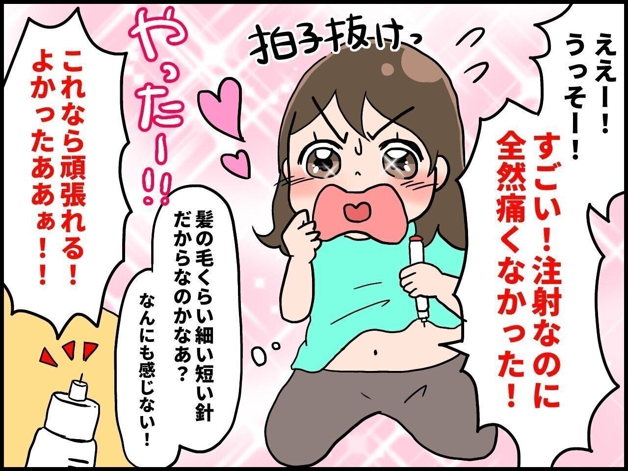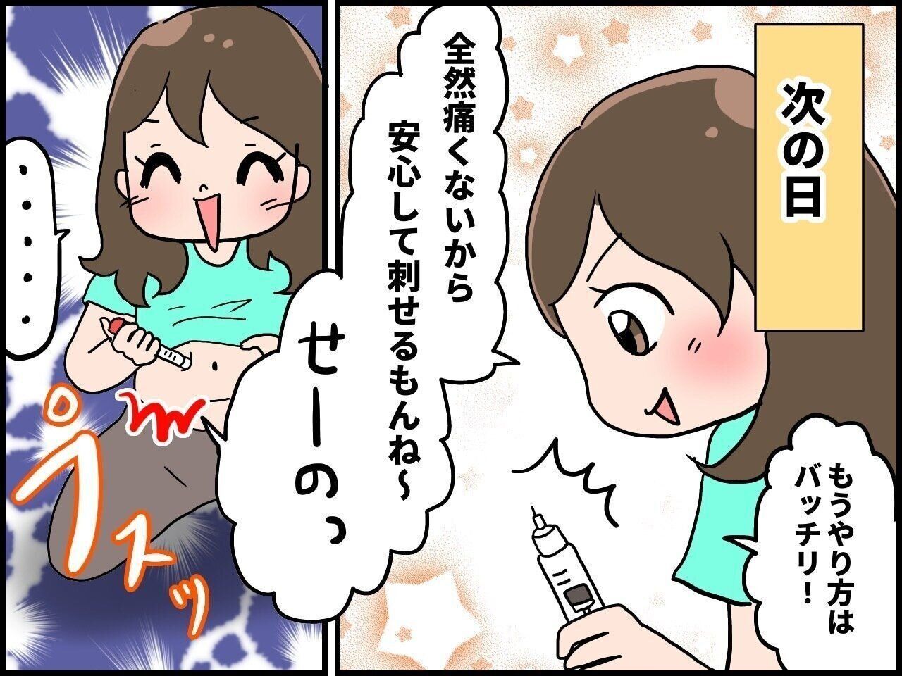 私の場合、全く痛くないと思って打つともちろん針なので痛みを感じたものの、結論、注射が嫌いでも頑張れるようなちょっとした痛みしか感じませんでした!