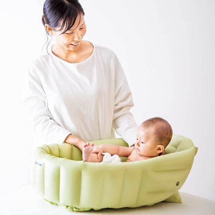 空気でふくらますタイプのベビーバス。やわらかカーブが赤ちゃんの背中にフィットし、ずり落ちを防ぐストッパーで赤ちゃんの体をしっかりホールド。空気を抜くとコンパクトに折りたためて、収納や持ち運びもしやすいと好評です。
