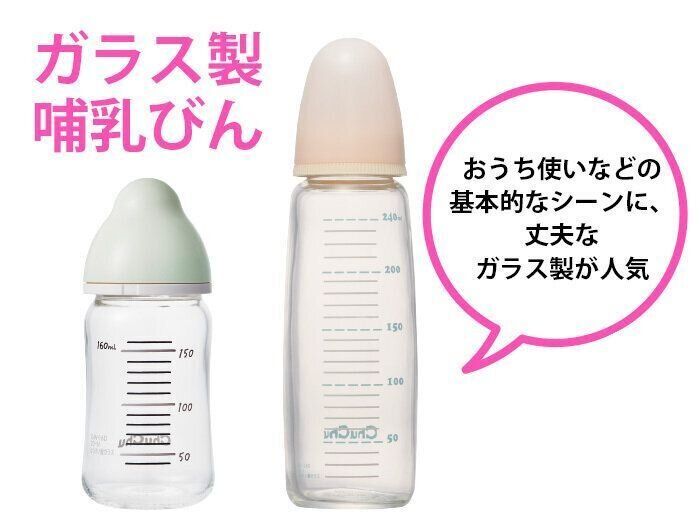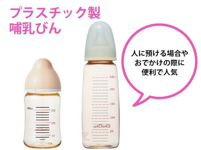 便利でかわいいチュチュの哺乳びんは耐熱ガラス製とPPSU(プラスチック)製の2種類の素材を展開(サイズや形状はさらに多様)。シーンに合わせて使い分けるのがおすすめです。