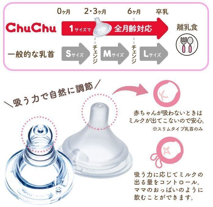 一般的な乳首は赤ちゃんの成長に応じてサイズ変更が必要ですが、チュチュの哺乳びん乳首は赤ちゃんの吸う力に応じてミルクの出る量がコントロールできるため、サイズアップ不要です。くわえたときの違和感がなく、赤ちゃんにとってはとっても安心。変化に戸惑う機会が減り、ママとパパ、そして赤ちゃんの負担が少なくなります。