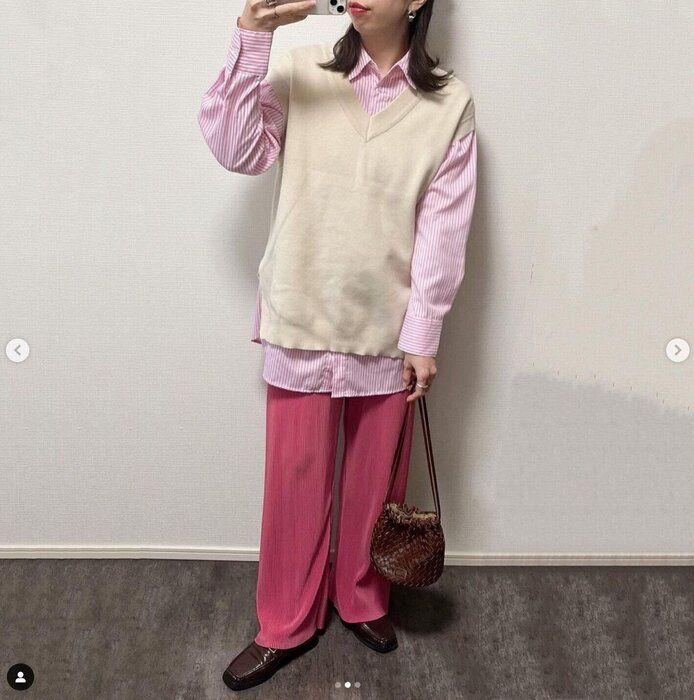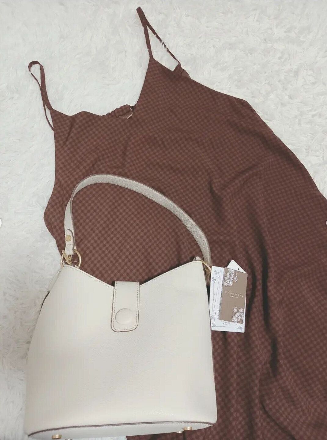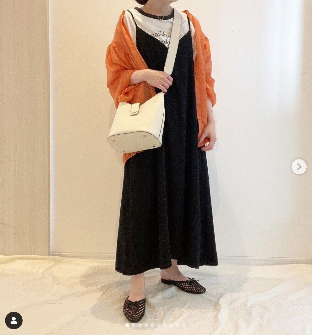 おふじさんはしまむらの69周年記念に行われた大創業祭でこちらのアイテムをGET!インスタで人気のインフルエンサーTERAさんとのコラボ商品「terawear emu」のキャミワンピースで、オフホワイトのバッグとも相性抜群ですよね。