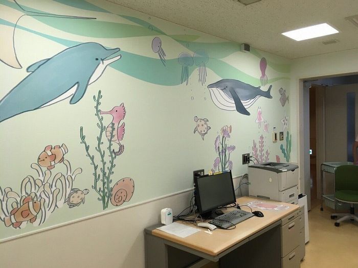 救急外来の壁には海の生物のホスピタルアートが描かれている。
