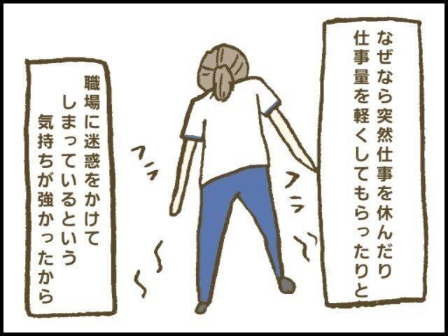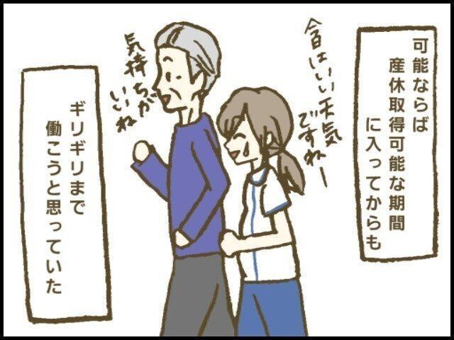 正直きつくてしょうがなかったです。が、切迫流産で突然2週間休んだり(第3話参照)、仕事量を軽くしてもらったりと"他の職員に迷惑をかけてしまっている"という気持ちが強くて、「今きつくて辛い」ということを職場の人に伝えることができませんでした。