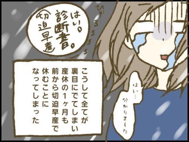 「2週間休んだ分、産休が取得できる時期に入っても少し長めに働こう」なんて考えてもいたのですが無理して働いた結果、切迫早産の診断がおり、産休の1ヶ月も前から休むことになってしまいました。
