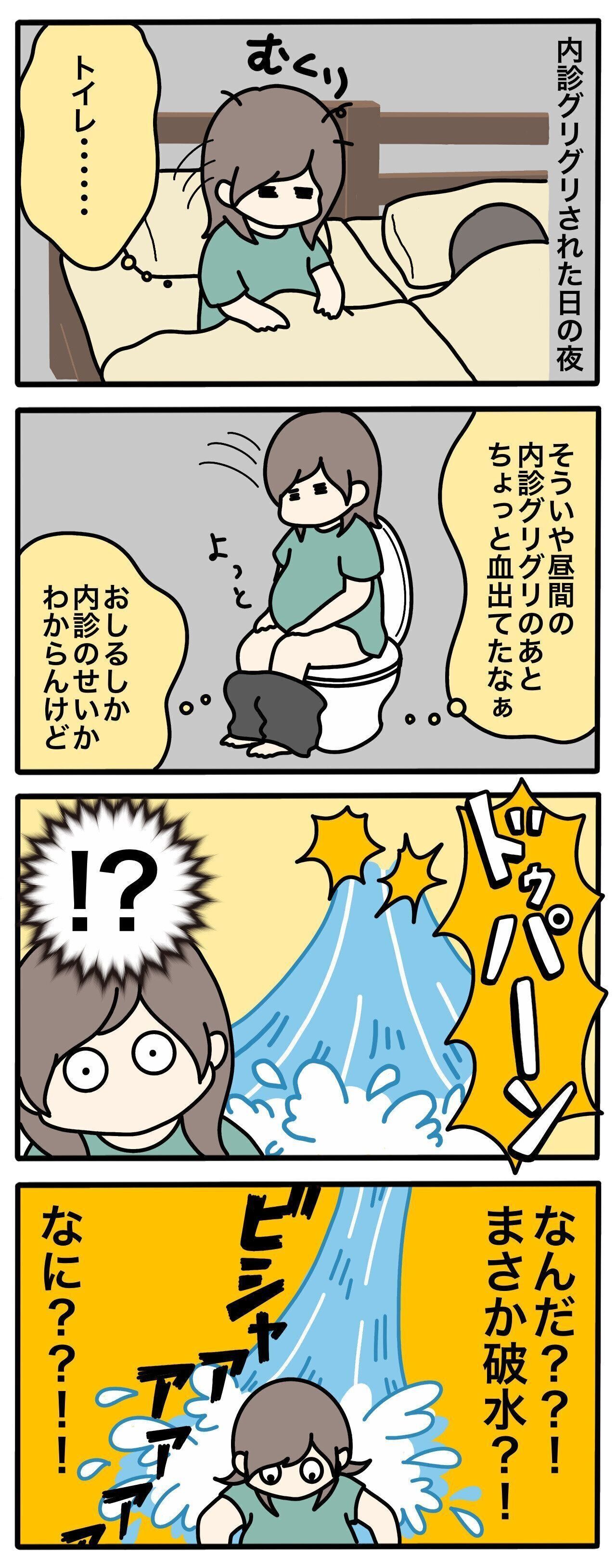 夜中の0時前くらいにトイレに起き、トイレに腰かけて少し力を入れた瞬間、ドパン!という衝撃とともに勢いよく水が!