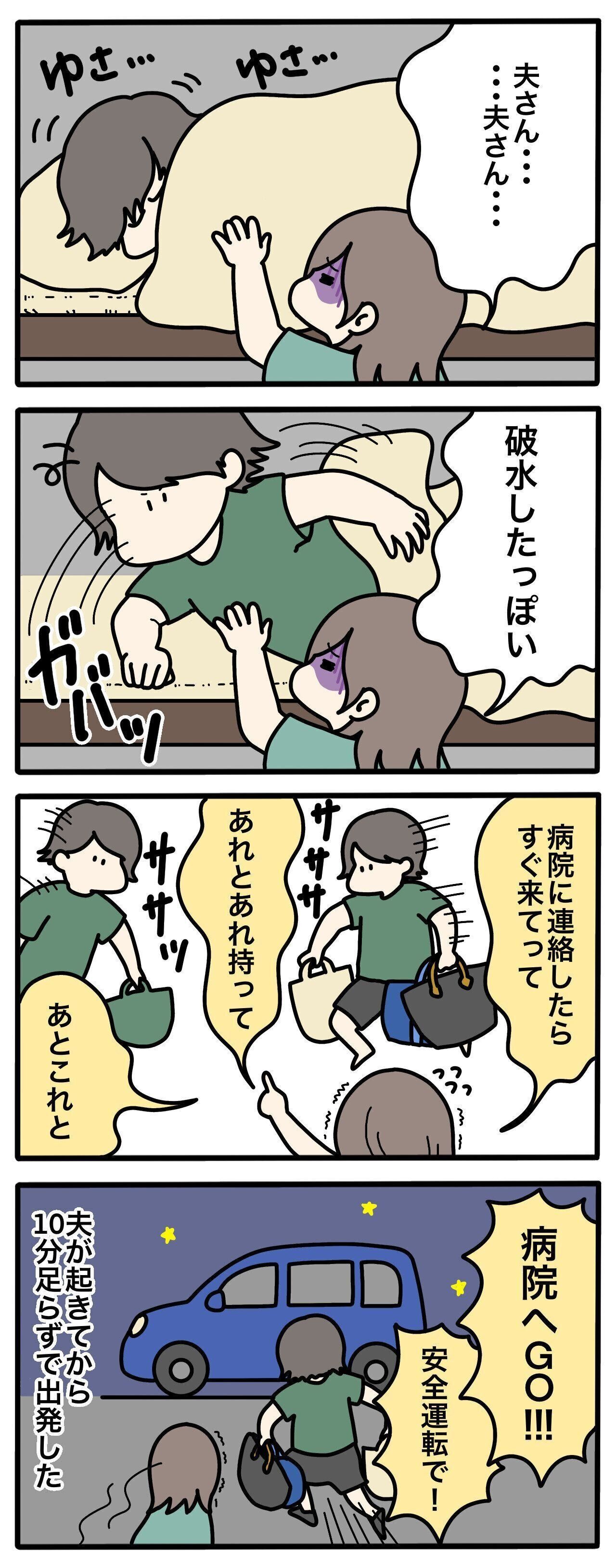 病院へ連絡したあとに夫を起こしたのですが、すぐに起き上がり、荷物運びからなにから全部やってくれて10分足らずで家を出発しました。