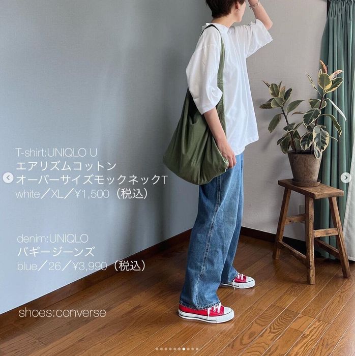 みーさんは、エアリズムコットンオーバーサイズモックネックT(メンズ)とバギージーンズを購入。Tシャツは、サラッとしたエアリズム生地と大きめの袖口で風通しも良いんだとか。袖が長めなので、日焼け防止にも効果ありそう!妊婦さんが着てもラクに過ごせるアイテムですよね。