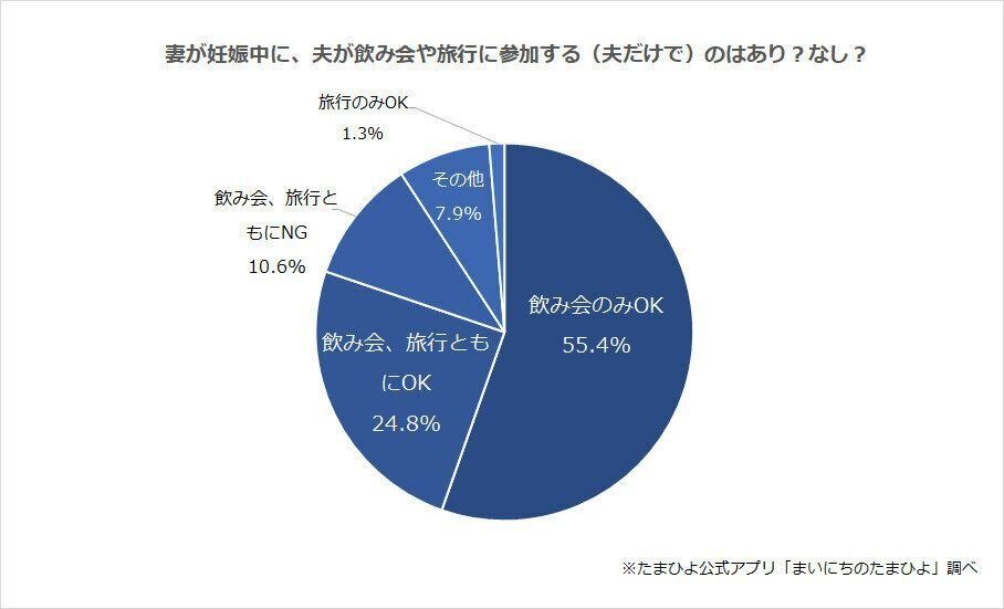 「たまひよ」アプリユーザに「妻が妊娠中に、夫だけ参加の飲み会や旅行はあり?なし?」と、質問。すると約55%のママは「飲み会のみOK」とし、「飲み会、旅行ともにOK」と合わせると約80%のママが、夫の飲み会には寛容であることがわかりました。しかしコメントでは「二次会NG」「帰宅後、家事全部やってくれるなら」など、条件付きが多数であることが判明。