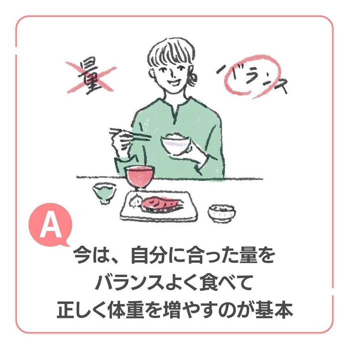 ⇒『今は、自分に合った量をバランスよく食べて正しく体重を増やすのが基本』