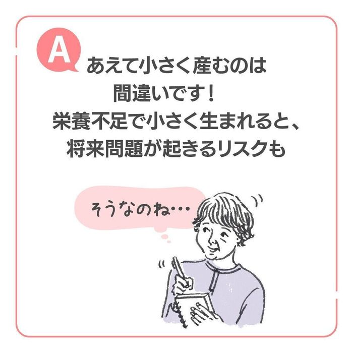 医療が今ほど発達していない時代、出産時の事故を防ぐために「小さく産むほうがいい」といわれていたこともあるようですが、今はあえて体重を増やさずに小さく産むのは間違い。