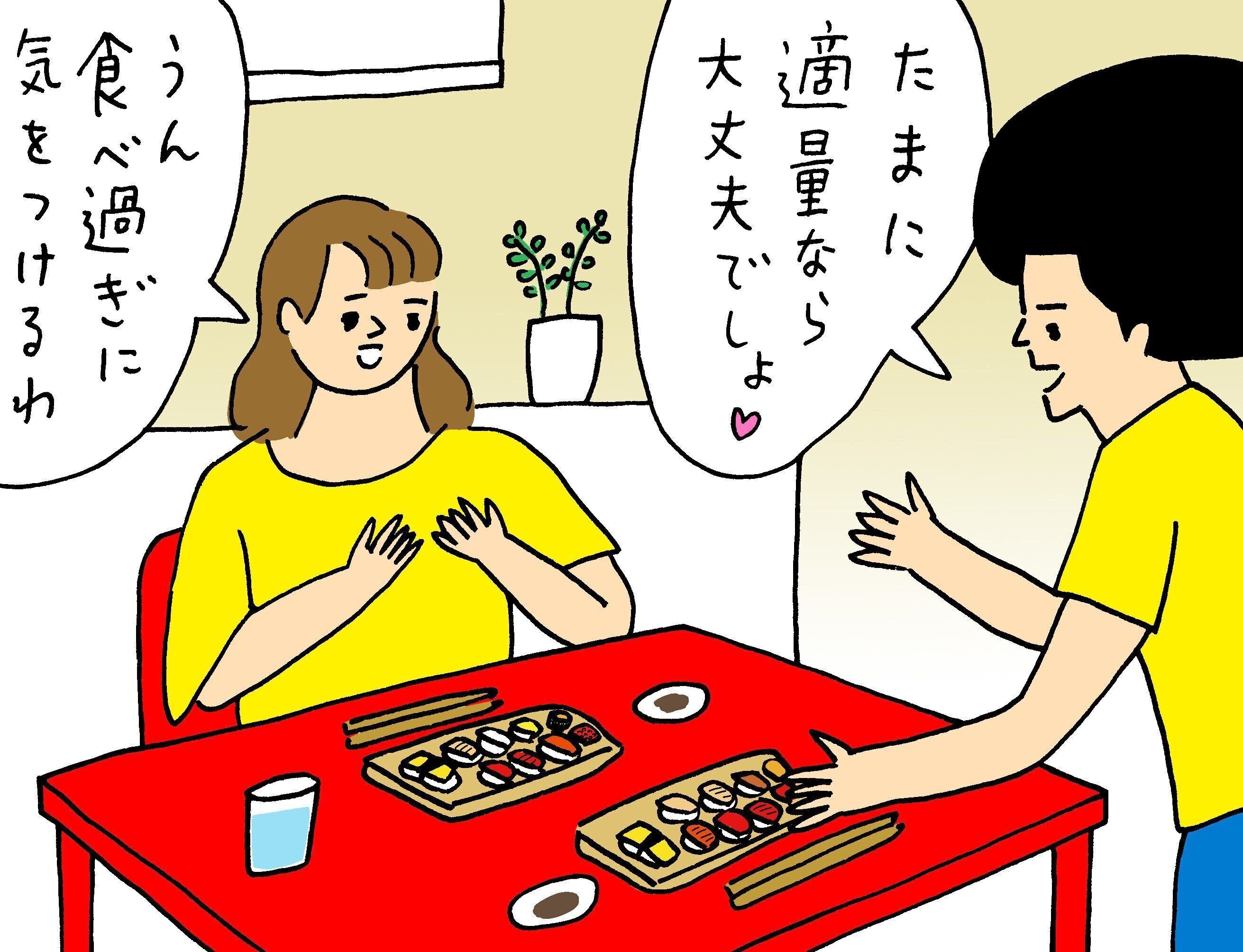 とはいえ、2週間に1回程度、新鮮なネタのおすしを、普通の1人前を食べる程度なら問題ないでしょう。食べすぎを防ぐためには、食べ放題のおすし屋さんは選ばないほうが無難です。