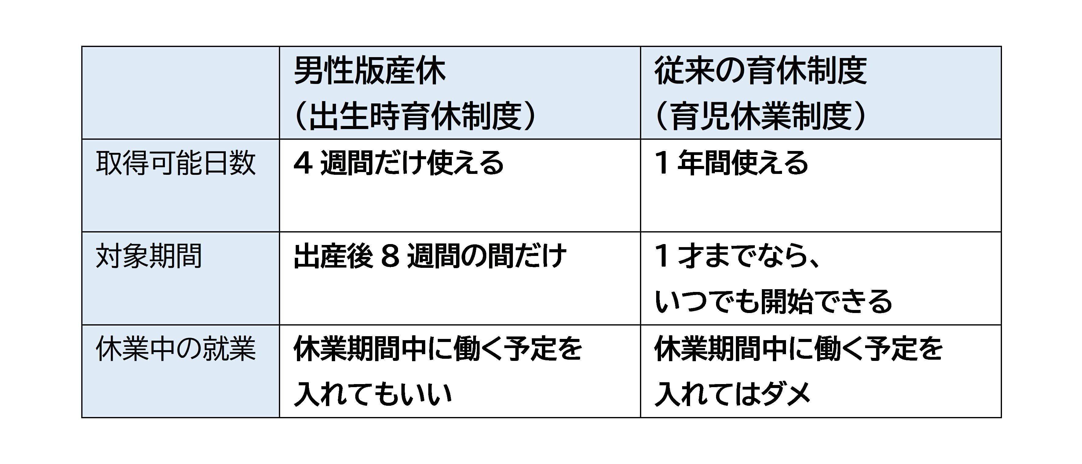 その男性版産休と従来の育休制度には上の表にまとめたような違いがあります。