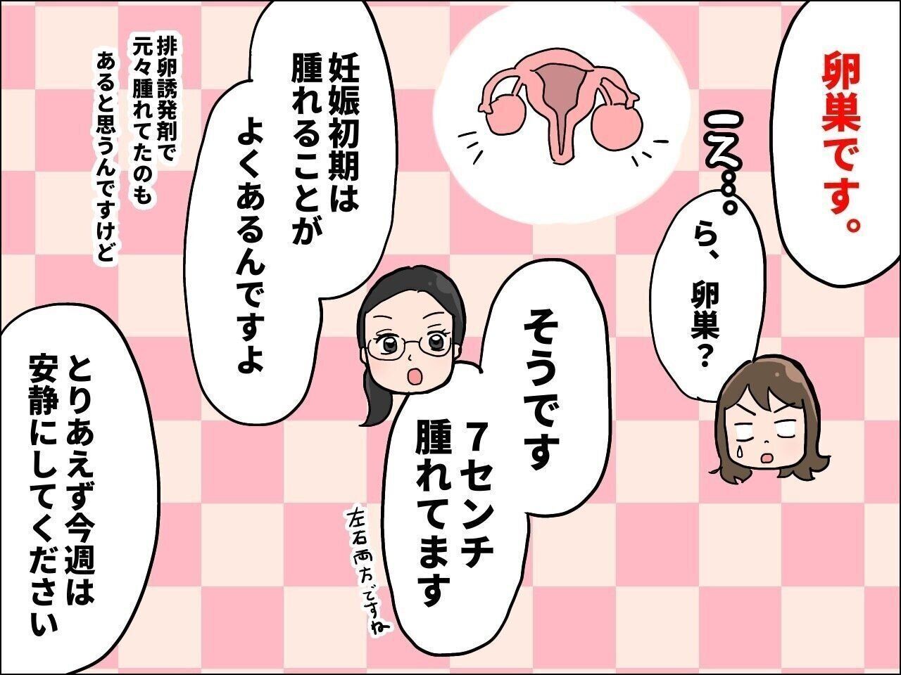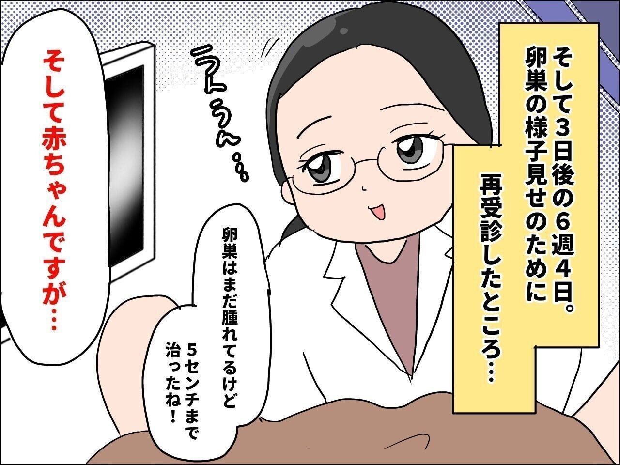 通常、心拍確認ができなかったら1〜2週間後に再受診という形となることが多いと思いますが、卵巣が腫れていたことにより、数日後に2回受診することとなり、赤ちゃんが日毎にかなり成長しているという様子を目の当たりにすることができました。