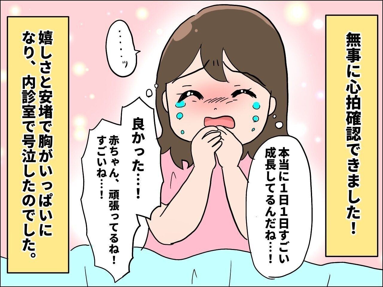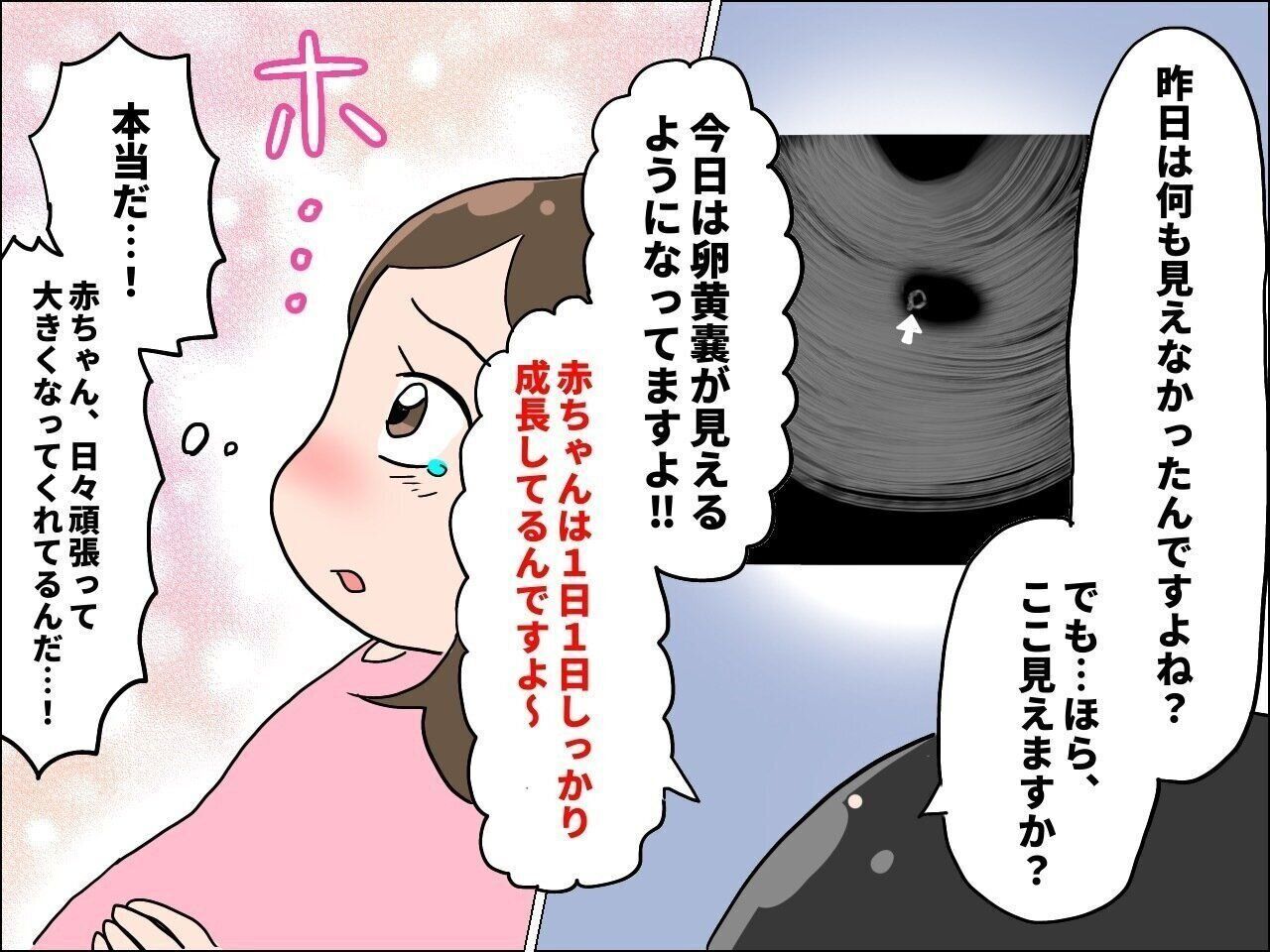 心拍確認できなかった日、不安でネット検索していると「おなかの中で頑張っている赤ちゃんを信じましょう」という言葉を目にしたのですが、赤ちゃんはその言葉通り、毎日必死に頑張っているんだなと思いました。