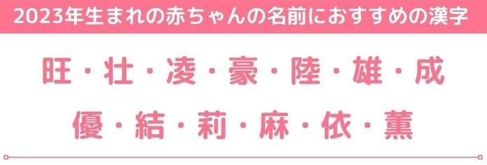 2023年に生まれる赤ちゃんは、「旺」「壮」「凌」「豪」「陸」「雄」「成」といった、たくましいイメージの漢字を選ぶと、星回りとして優しさを備えて生まれながらも、ここぞという場面では強さを発揮できる人になるでしょう。また、四緑木星が持つ優しさをそのまま素直に表現できるように、「優」「結」「莉」「麻」「依」「薫」といった優しい漢字を使うのもおすすめです。