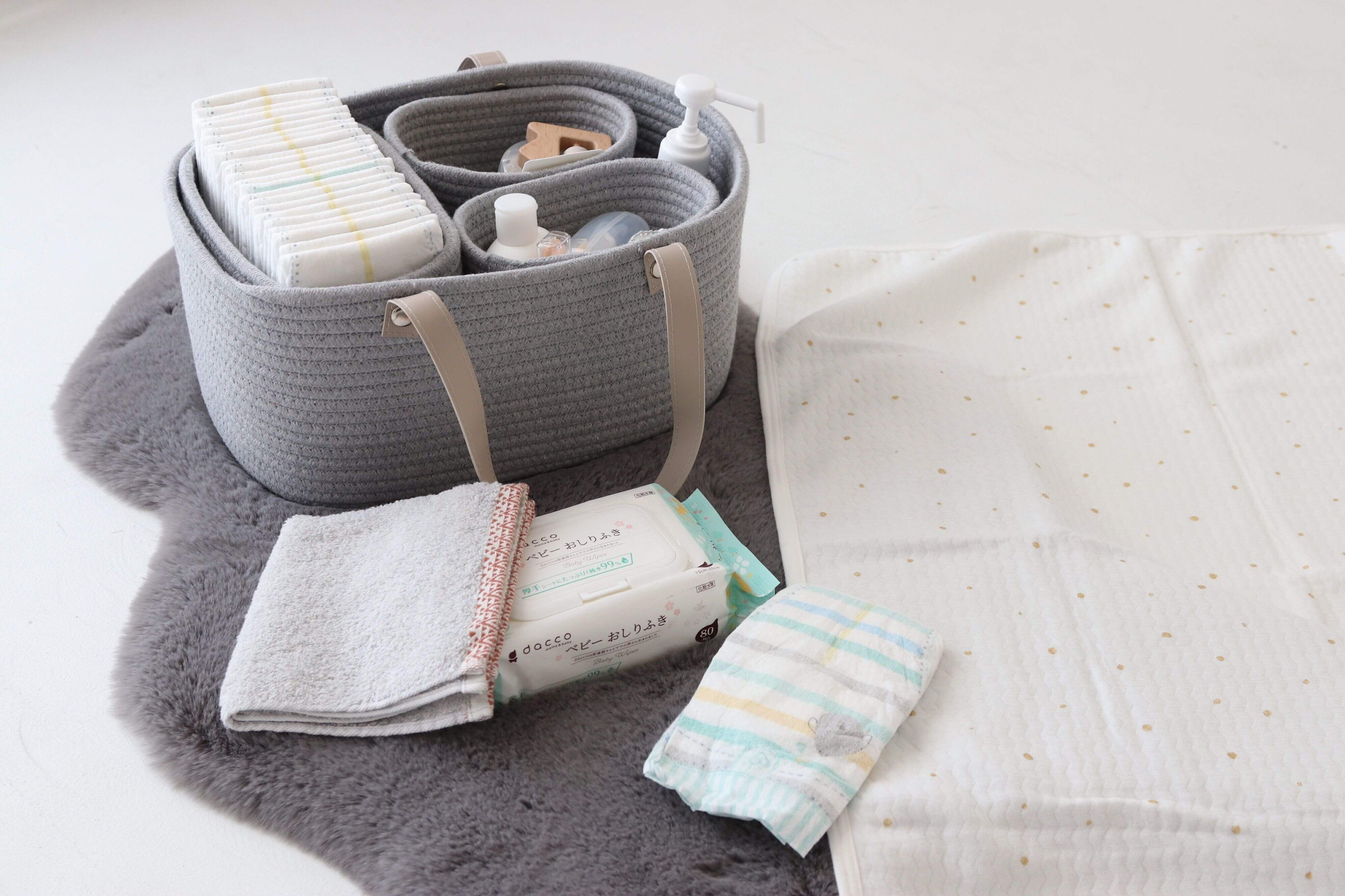 おむつ替えやスキンケア用品は、ひとまとめにしておくのが正解。これはナチュラルなコットンロープ編み×合皮の持ち手のおむつストッカー。3個の仕切りかごもしっかり自立するので、取り出して使うときに便利。持ち手つきなので、違う部屋や、車内で使うときも、そのままサッと持ち運べます♪
