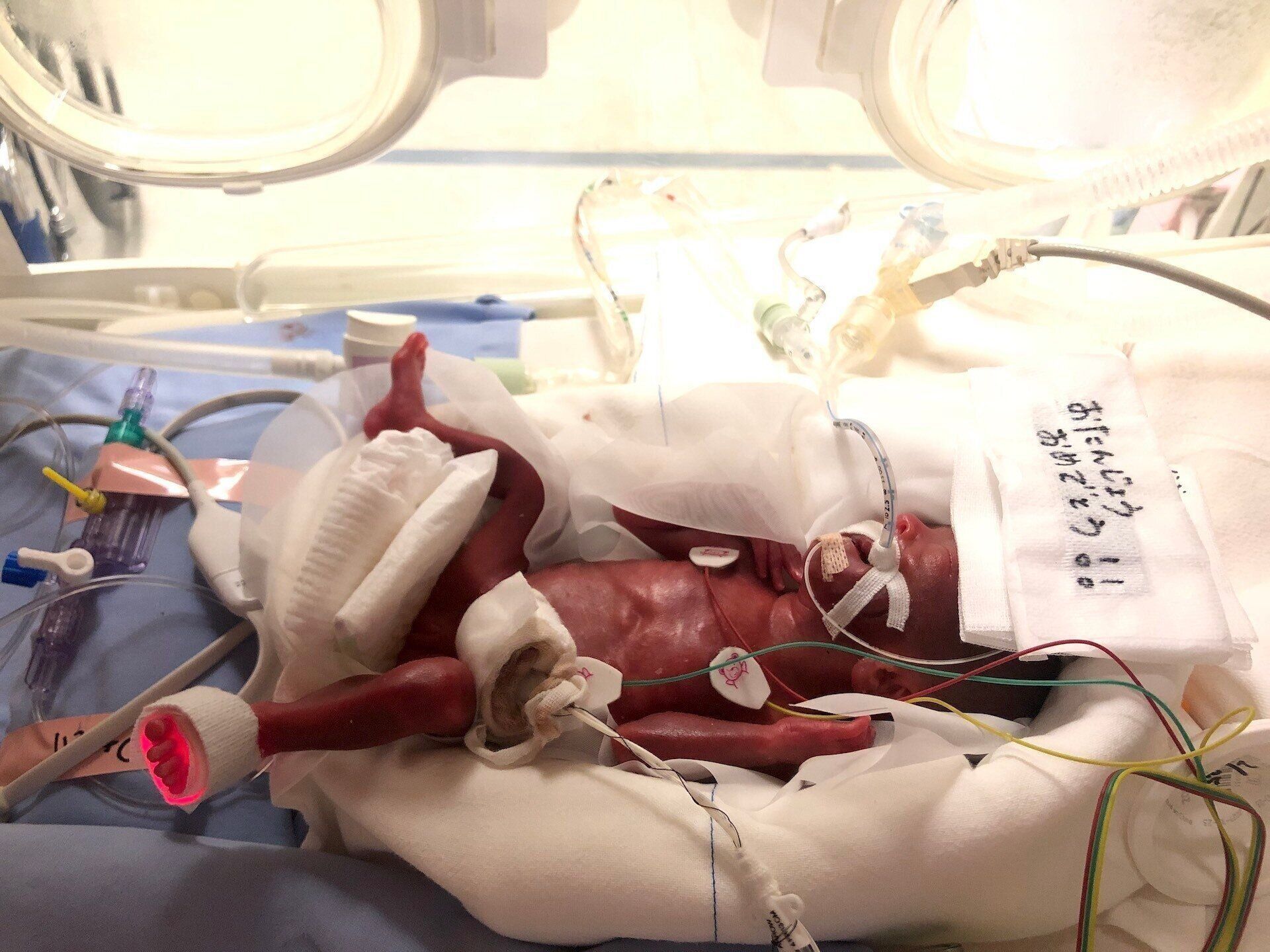 一貴 1時間くらい待ったころ、看護師さんが「生まれました、女の子ですよ」と保育器に入った娘を連れてきてくれました。初めて目にした赤ちゃんは、想像していたよりもずっと小さい姿。皮膚も薄くて赤黒く、たくさんの管につながれていていました。