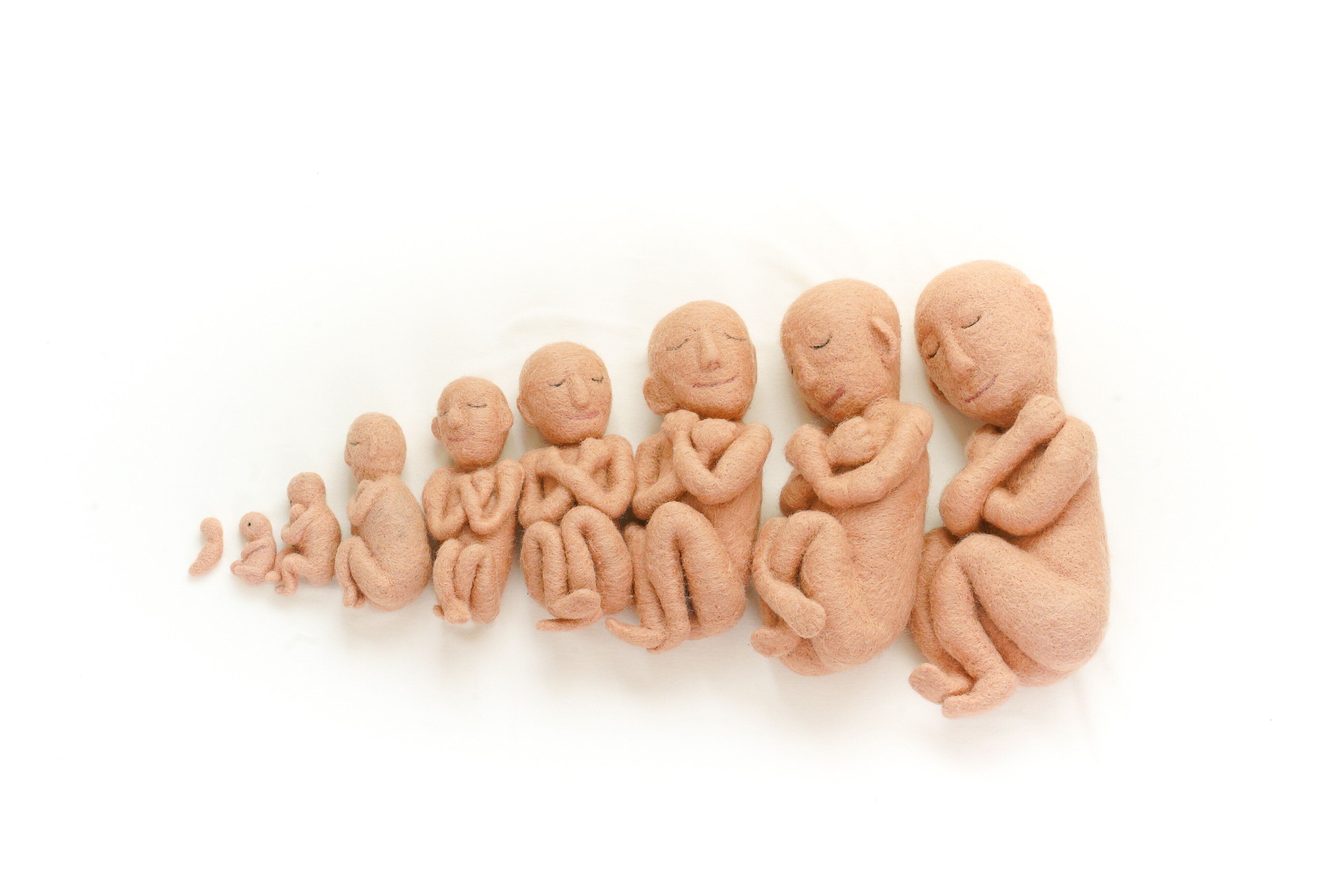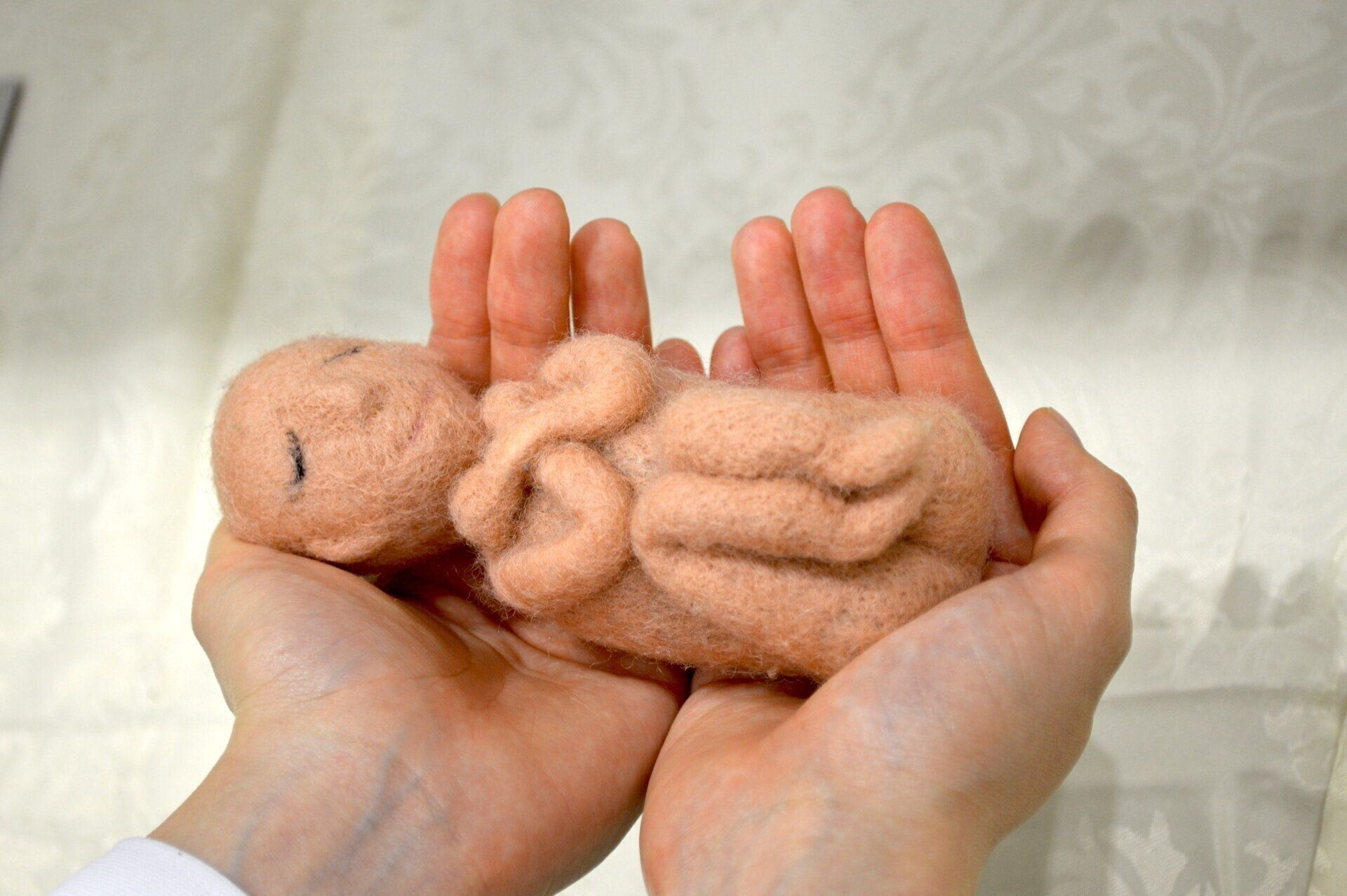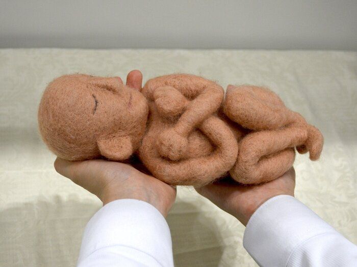 小林 はい。この胎児人形は、羊毛フェルトといって、羊の毛にニードルパンチという針を刺して固めて形づくる技法で作っています。大きさは胎児の医学模型を採寸して、重さは胎児の平均体重と同じ重さになるようにおもりを入れています。