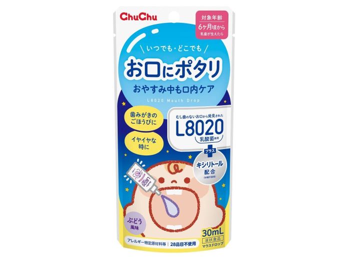 赤ちゃんが急に寝てしまった、歯みがきをイヤがったなど、毎日のオーラルケアがうまくいかないときも当然出てきます。そんなときに役立つのが、ChuChuの「L8020乳酸菌 マウスドロップ ぶどう風味」です。
