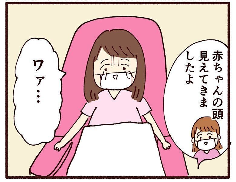 割と体力が限界だったところに「赤ちゃんの頭見えてきましたー!」の声。嬉しすぎる。