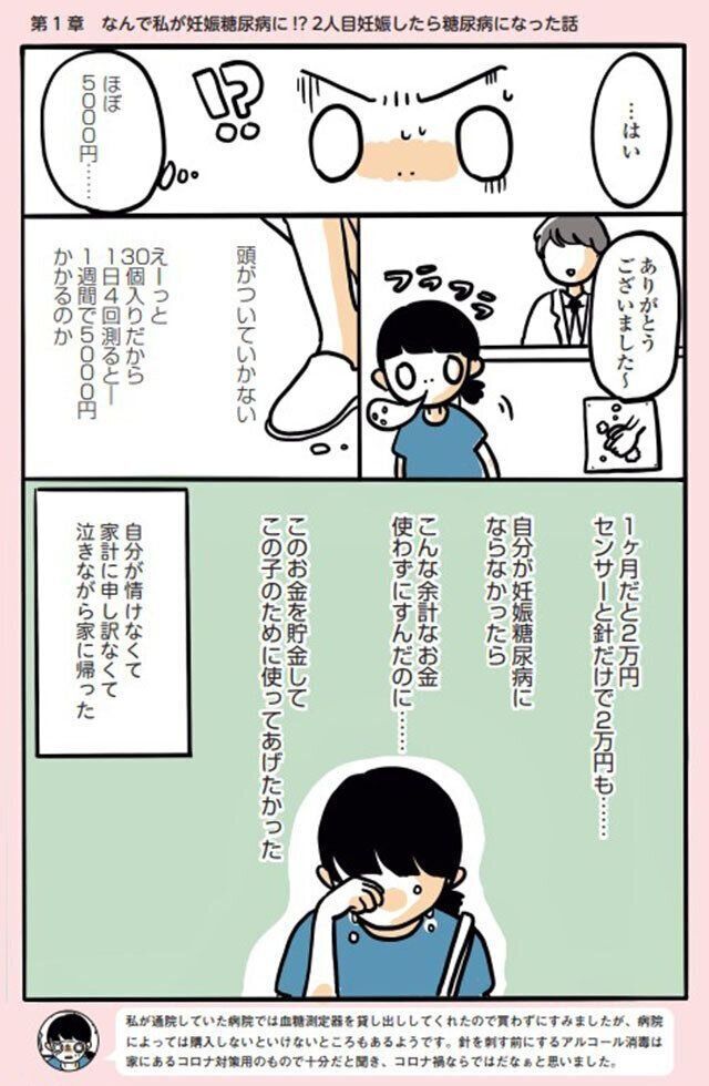 奥田けい「病院によってまったくちがうので参考にならないかもしれませんが、私は血糖値を測るための針とセンサーというものだけで、ひと月に2万円かかりました。これが金銭的に1番キツかったです。さらに糖尿病科に診てもらう費用(2,000〜3,000円ほど)、血糖コントロールのための栄養指導にかかる費用、プラスの採血費用など……健康な妊婦さんでは必要ない費用がかかりました」