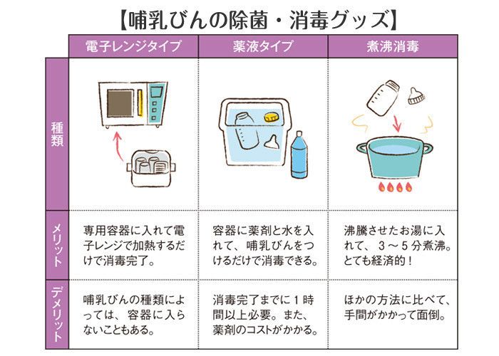 哺乳びんの除菌には、上の図のような3つの方法があります。それぞれのメリットとデメリットを比較して、自分が続けやすい方法を選びましょう。