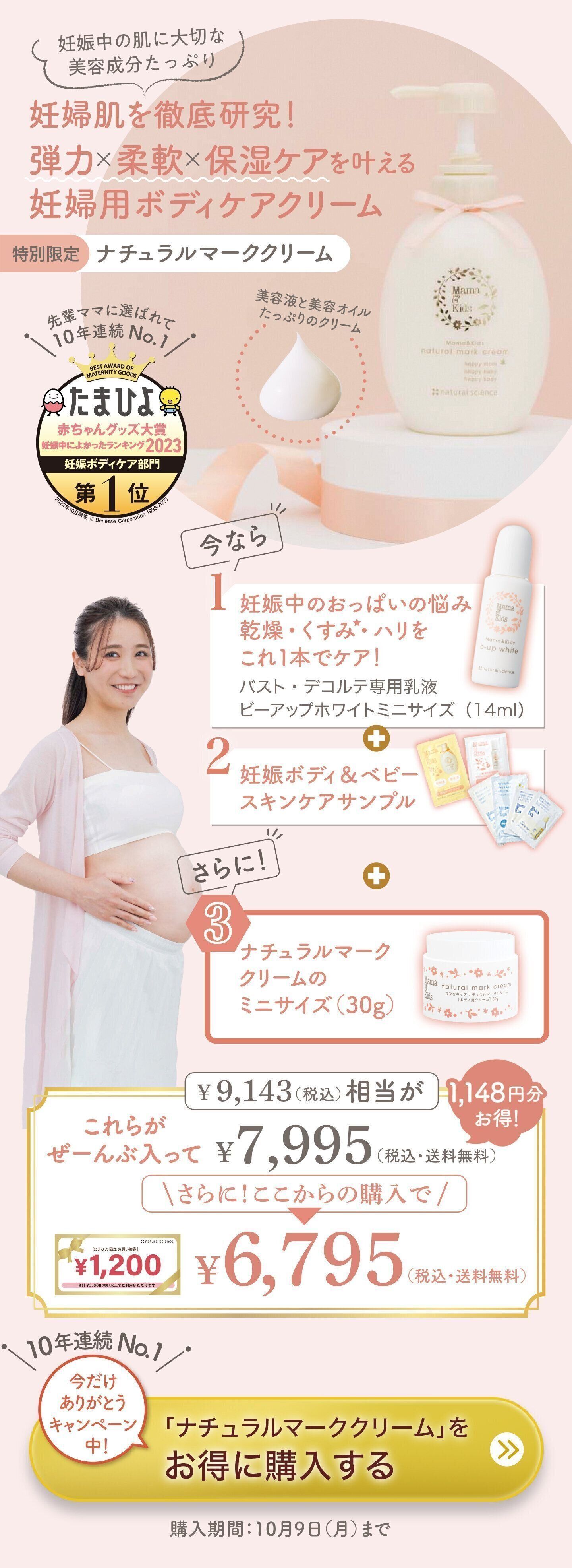 ナチュラルマーククリームは、つわりの時期でも使いやすい無香料・低刺激処方。妊娠初期からにおいを気にせずケアできて、敏感になりがちな肌にも安心して使えます。