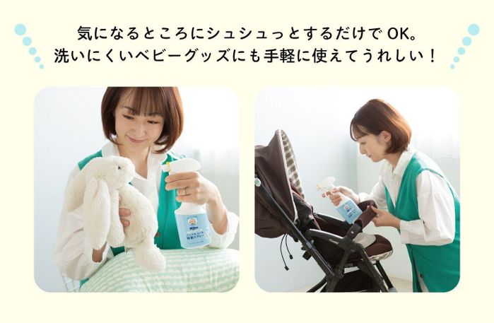 さらに、できるだけこまめに衛生対策をしたいけれど、産後のバタバタで時間をかけて対策するのが難しい場面も。だからこそ、ベビーグッズに安心して使えて、しかも手軽に除菌ができるアイテムが頼りになるんです。
