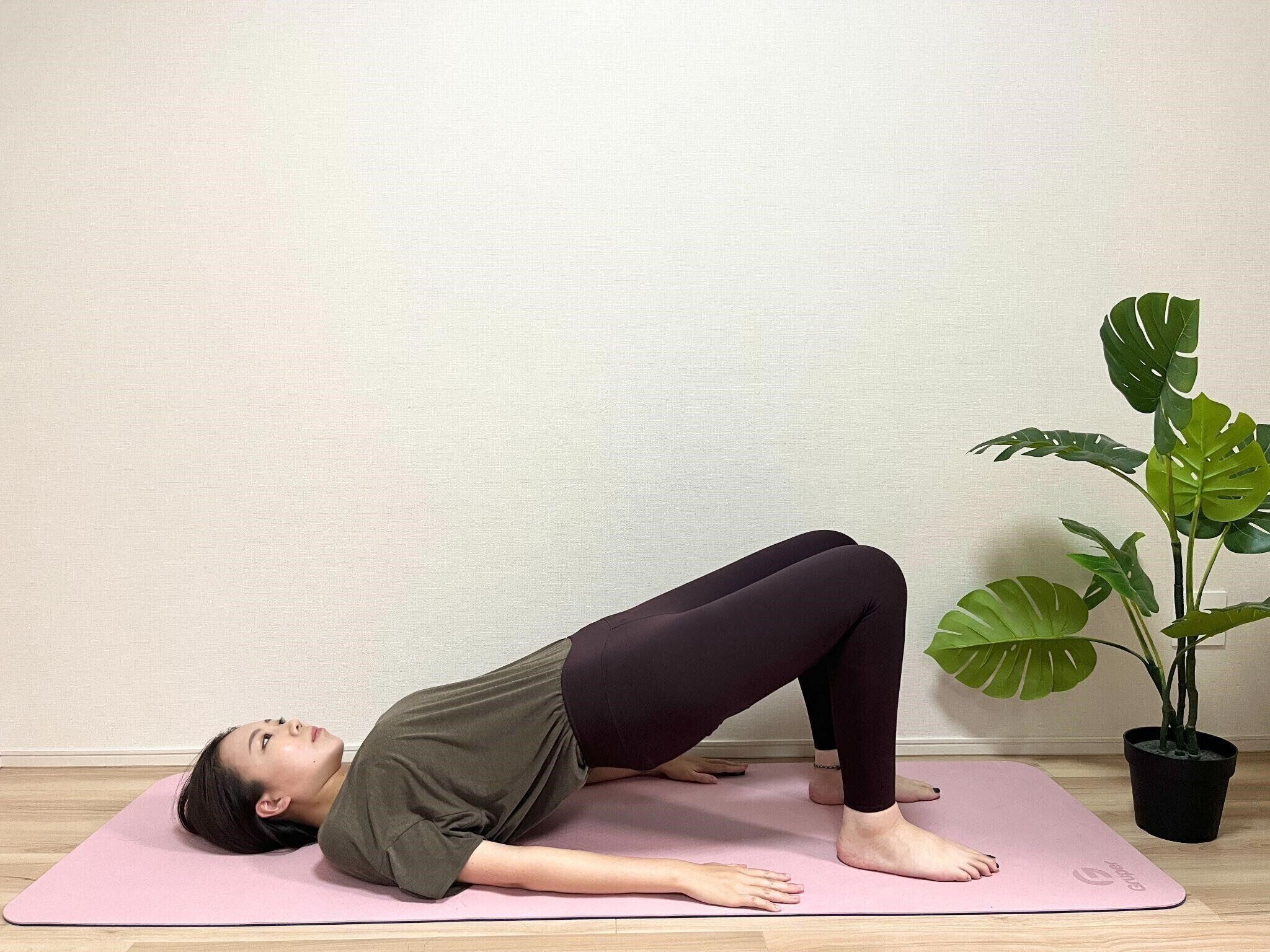 (2)両手はからだの横に置き、お尻を持ち上げる。膣を締めながら肩からひざまで一直線にした姿勢を10秒キープする。