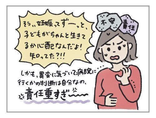 そう、自分が妊婦になってびっくりしたのは、妊娠って、ずーっと、子どもがちゃんと生きてるか心配なんだってこと。妊娠の経過が安定していても、いつ何が起こるかわからなくて、出産直前まで不安なのだと、初めて知りました。しかも、異変に気付いて病院に行くかどうか判断するのは、自分・・・。責任が重すぎて、怖い!!