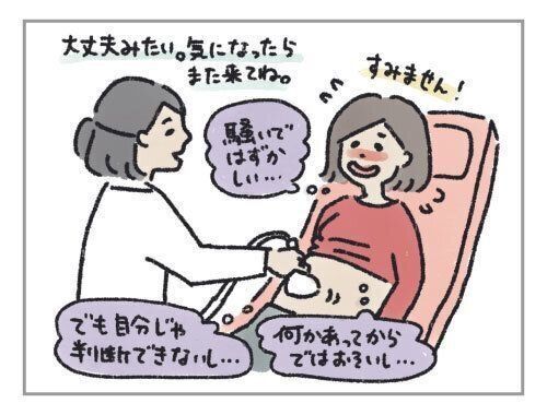 診てもらったら問題はなく、「大丈夫そうです、良かったですね。でも、気になったらまたいつでも来てくださいね」とのこと。診察後にまた胎動を感じて、ホッと安心すると共に、なんだか慌ててしまって恥ずかしいような気持ちに。でもでも、自分では判断できないし、何かあってからでは遅いし、しょうがないんです。