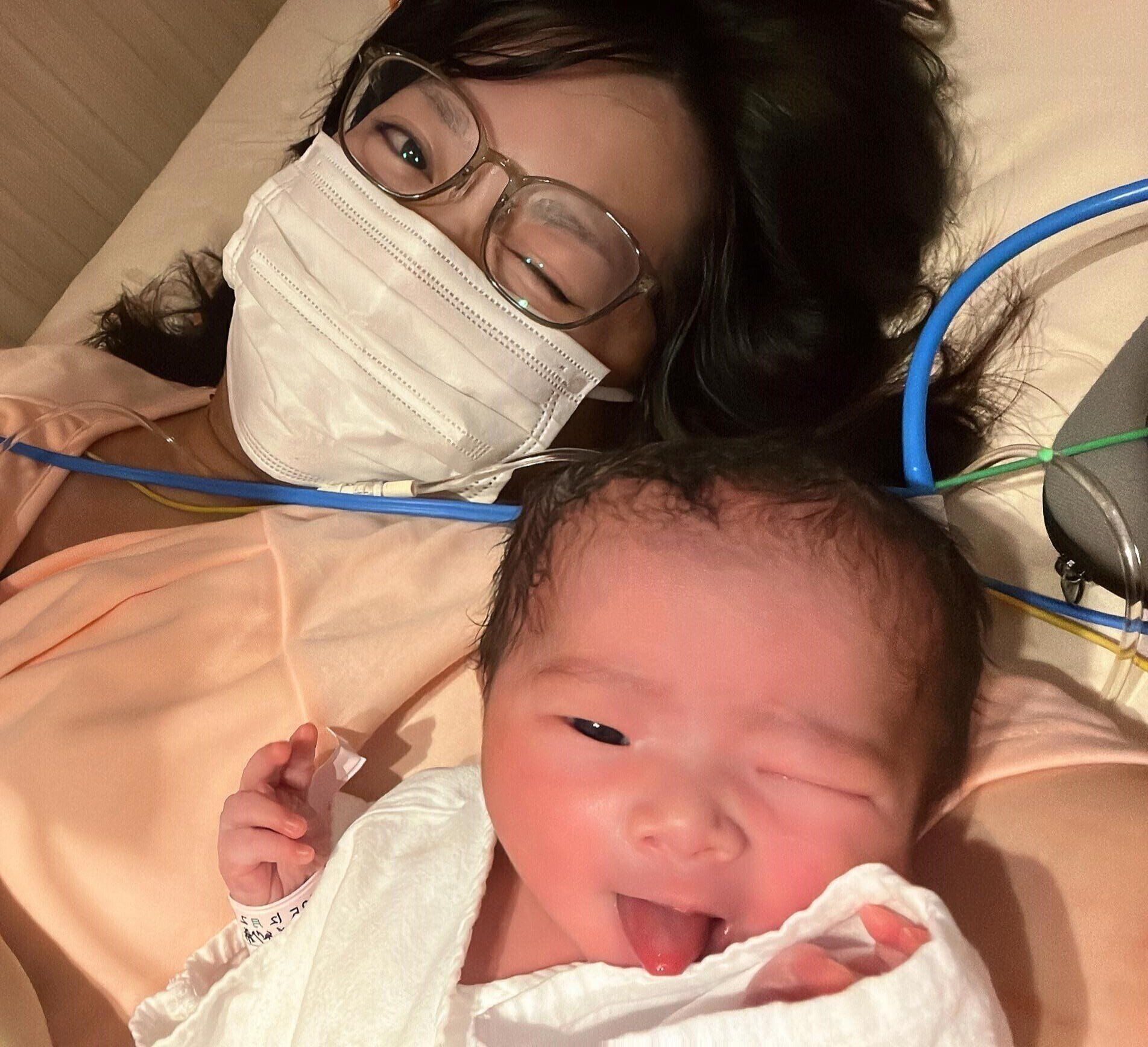 ふぇ、ふぇ、と小さい声を何回か少し出す→すぐお口の中吸ってもらってしっかり泣き出す!赤ちゃんとほっぺたくっつけて記念写真