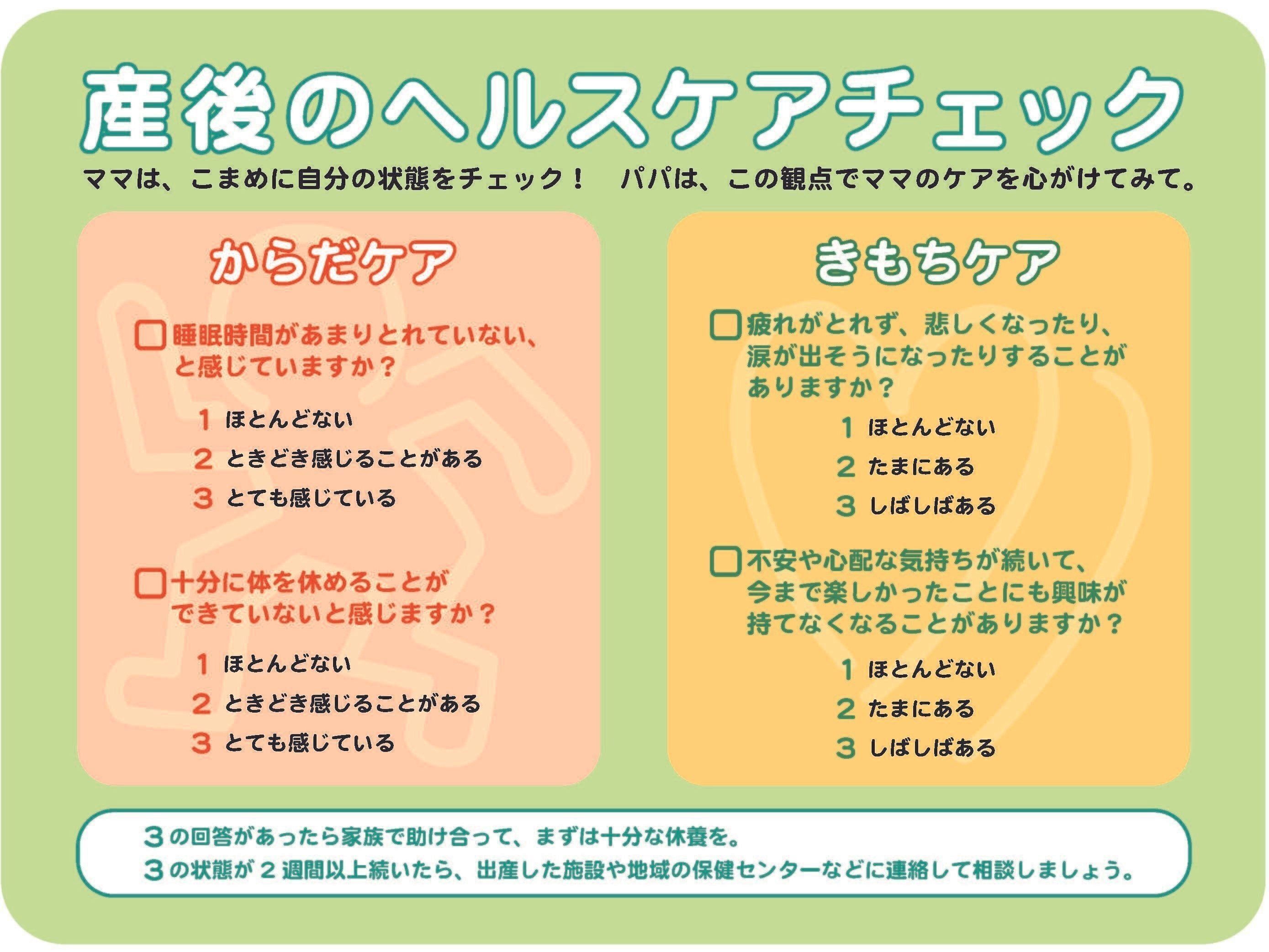 ママの産後の不調が、ただの産後の疲れなのか、産後うつにつながる症状なのか、ママ自身が自分で見極めることは難しいもの。そんなとき、ママの様子を見ながら簡単にチェックできるリスト(上記)を紹介します。産後はこのチェックリストをいつでも見られるようにしておき、気になることがあれば出産した産院や地域の保健センターへ、気軽に相談に行くようにすすめてあげましょう。