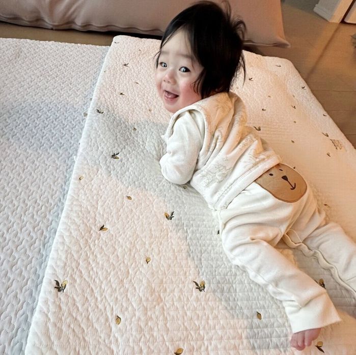 「ボディオールはやわらかく伸縮性のある生地だから着せやすいのが魅力。6カ月のうちの子は、ズリバイをよくするのでおしりのクマさんが見えて、かわいいです! 前開きなので、小児科の診察や健診があるときに便利でした。ベストはほどよい厚みがあって温かい感じ。ふわふわの手触りが抱っこしても気持ちがいいです! 寒い日は肌着を2枚重ねようか迷うのですが、日中脱がそうと思うと面倒なので、ベストだと着脱が簡単で体温調節がしやすいですよ」
