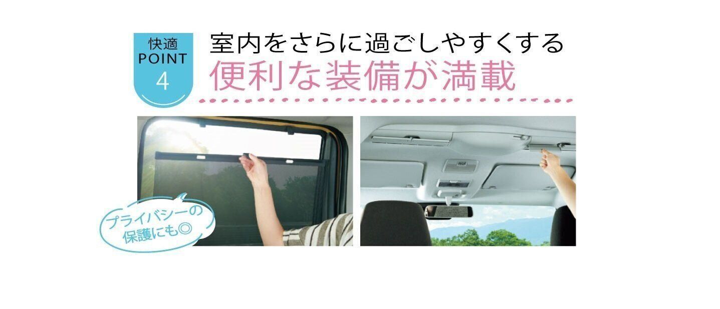 車内の空気を循環させるスリムサーキュレーターが、前席と後席の温度の偏りを解消し、いつでも室内全体が適温。また、直射日光を防ぐロールサンシェードは、目隠しにもなり、赤ちゃんのお着替えや授乳時にも役立ちます。