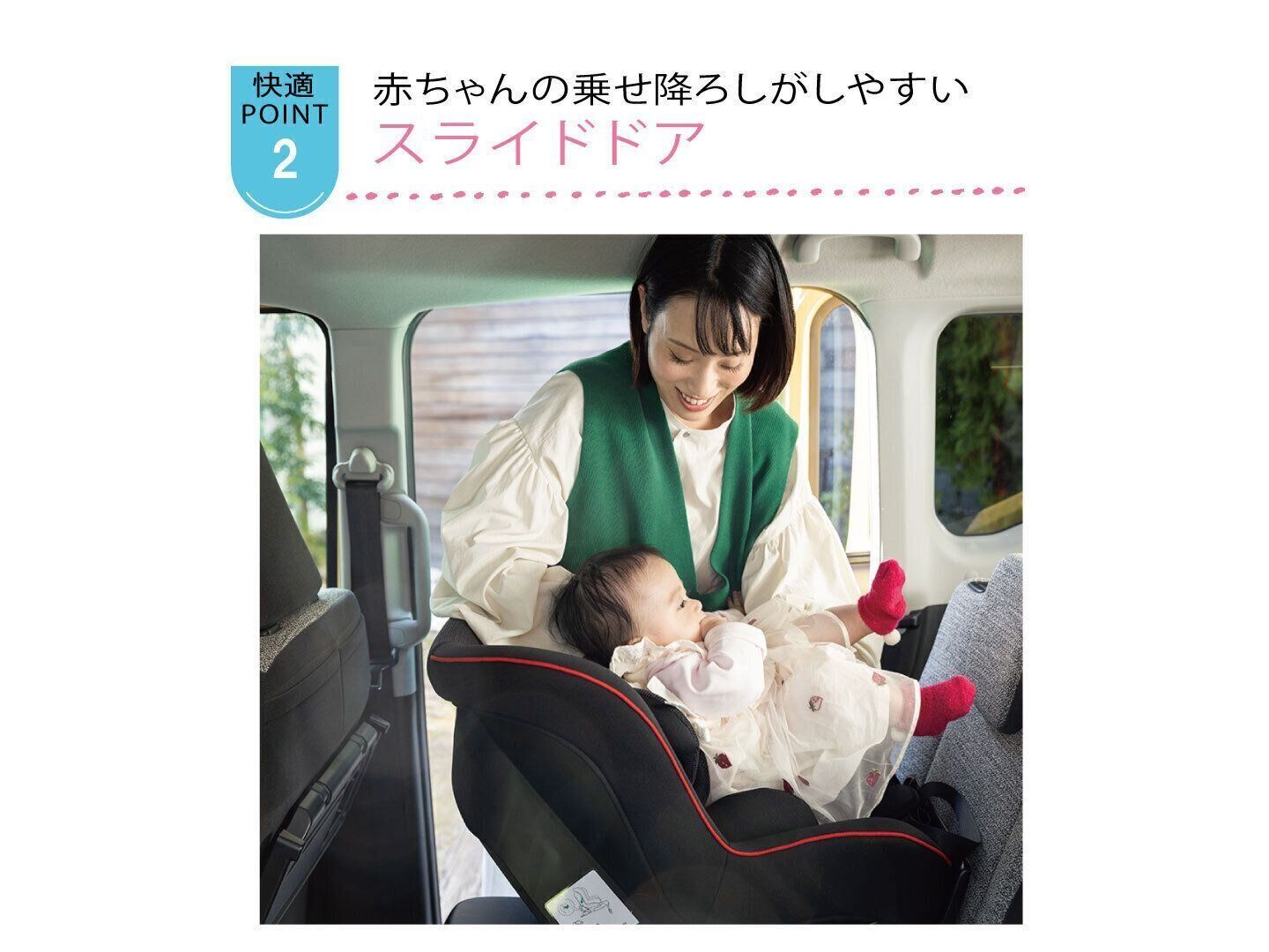 スイッチひとつで自動解錠&自動オープンするスライドドアだから、赤ちゃんを抱っこしていてもスマートに操作可能。後席両側が大きく開くので、狭い駐車場でもドアの開閉に気を使わずラクに乗り降りできます。