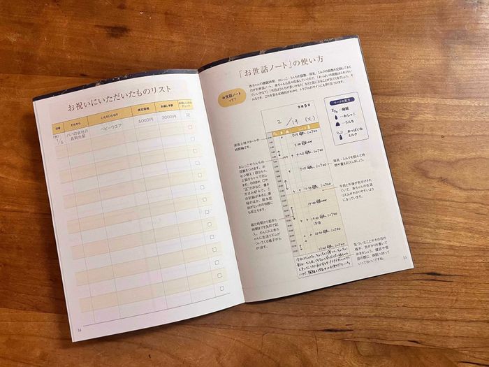 前半ページには、妊婦健診ノートがついています。妊婦健診でママが感じたことや不安などを共有したり、お産が始まったときの連絡先や赤ちゃんへのメッセージなど、2 人で話し合いながら書き込んでいくのも楽しいですね。そのほか、「お産入院記録」や「お祝いにいただいたものリスト」などを書けるページも。