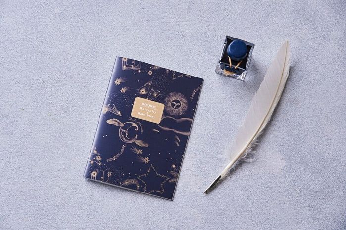 全ページにわたって、MARLMARLの新作の“meteor(メテオール)”のテキスタイルを使ってデザインしました。メテオールとは、フランス語で「流れ星」のこと。描かれている星座は、願いが込められたMARLMARLのオリジナル星座です。大人が持っていても様になるネイビーとゴールドの組み合わせがとてもシックですてきです。