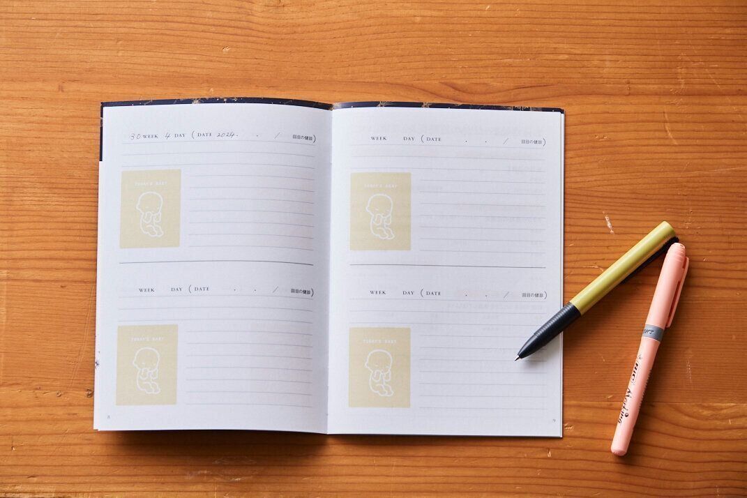 後半ページには、睡眠時間、おしっこ・うんちの回数、母乳・ミルクの量などを簡単に記録できるページが1カ月分ついています。記録することで育児がラクになったり、トラブルのサインに早く気づけたりすることも。簡単に書ける仕様になっているので、ぜひ使ってください。