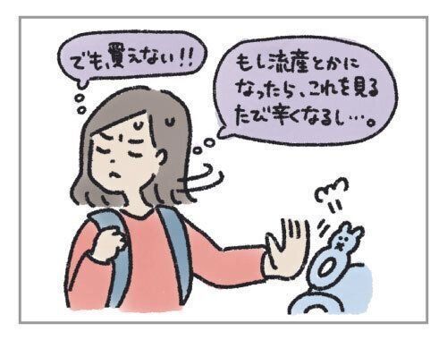 妊娠初期、ふらりとベビーグッズを見たりして、「あ!このおもちゃ可愛い・・・」と思っても、なかなか買うことができませんでした。「もし流産とかになったら、これを見るたびに辛くなってしまう・・・」と、不安でたまらなかったからです。不妊治療でなかなか授からなかったこともあり、私なんかが順調に行くとは思えない、という妙な疑念があったのです。