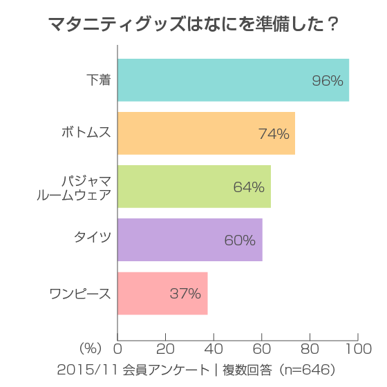 その結果、一番多かったのは「マタニティ下着」で、なんと92.5%もの方が購入したとの結果に。「締めつけがツラくなってきて一番に下着を購入した」との意見が多くみられました。特にブラは産後のことも考えて、この頃から少し大きめの授乳用ブラやワイヤーなしのカシュクール型のものを購入する方が多いようです。