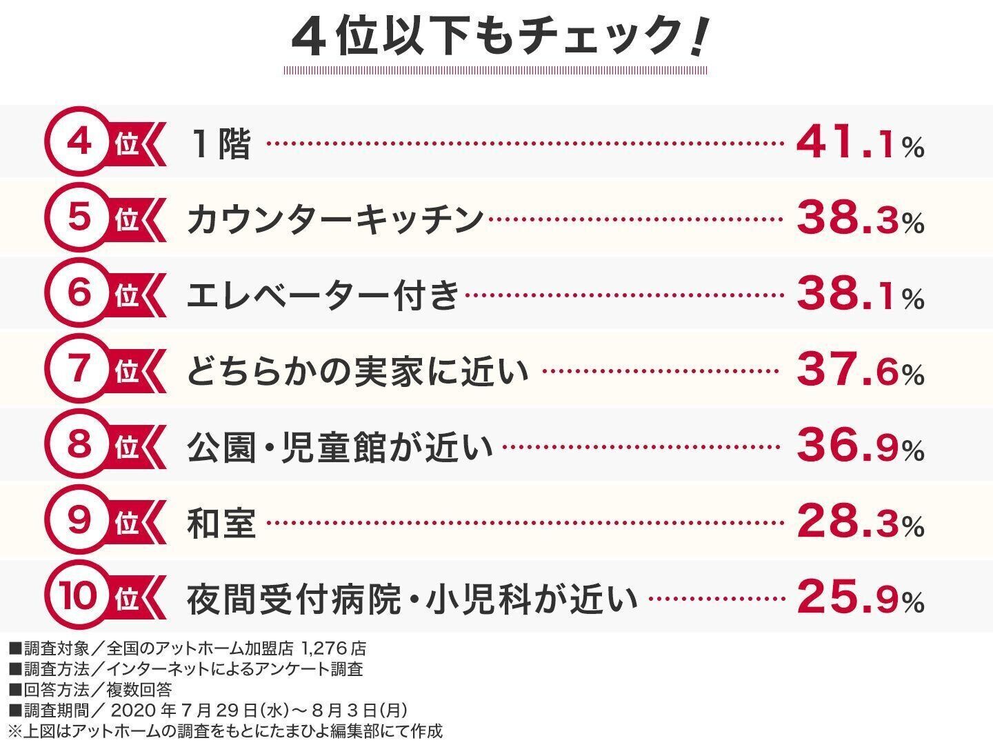 ほかにも、子どもの足音が階下に響かない1階、子どもの様子を見ながら食事の準備ができるカウンターキッチンなども上位に。ハイハイするのに安全という和室にも注目。和室に限らず畳スペースのある物件は人気で、注文住宅の場合は子育て世帯に畳はマストと言う声も。