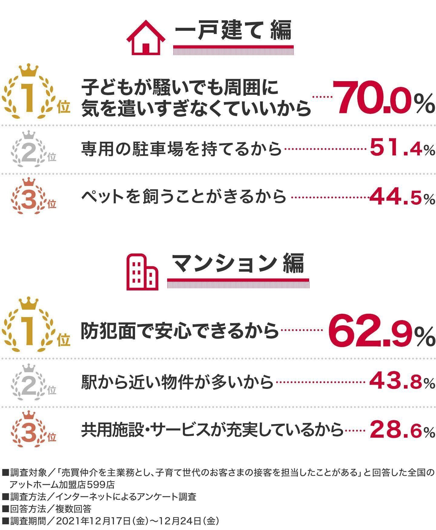 下記は、全国のアットホームの加盟店を対象に実施した「一戸建てとマンション 子育て世代におすすめの理由」をアンケート調査した結果。一戸建てとマンションそれぞれの、不動産のプロがおすすめするすポイントのランキングは?