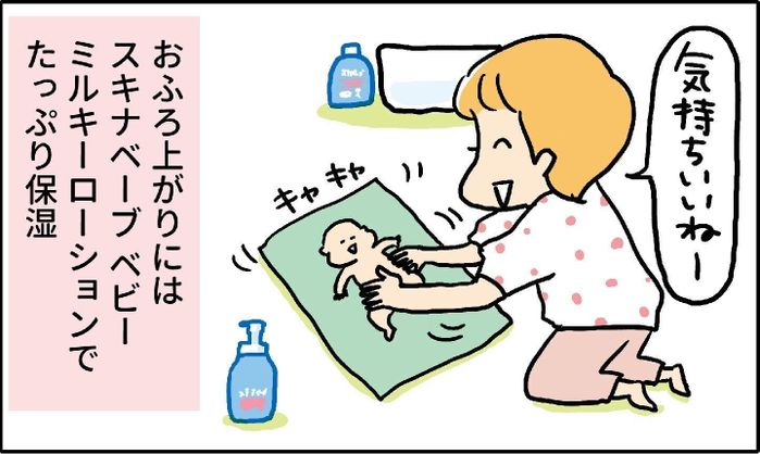 沐浴後は「スキナベーブ ベビーミルキーローション」で保湿。1本で顔も体も全身に使える便利さがGOOD!