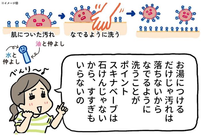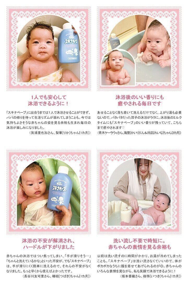 「スキナベーブ」は、発売から50年以上、ママ・パパたちに愛されている石けんいらずの沐浴剤です。ベビーバスに「スキナベーブ」を入れて、赤ちゃんを洗うだけ。新米ママ・パパにおすすめです。