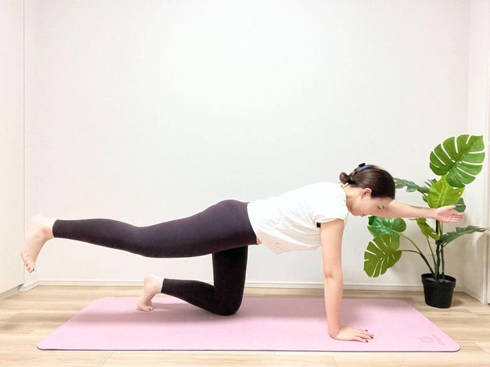 腰が反らないようにおなかにしっかりと力を入れて、頭の先から伸ばした脚が一直線になるように意識します。ぐらぐらしてしまう場合は、ひざを付いている脚を真横へ少しずらしてみましょう。背中やお尻の引き締めにも効果的で、体幹を鍛えられます。