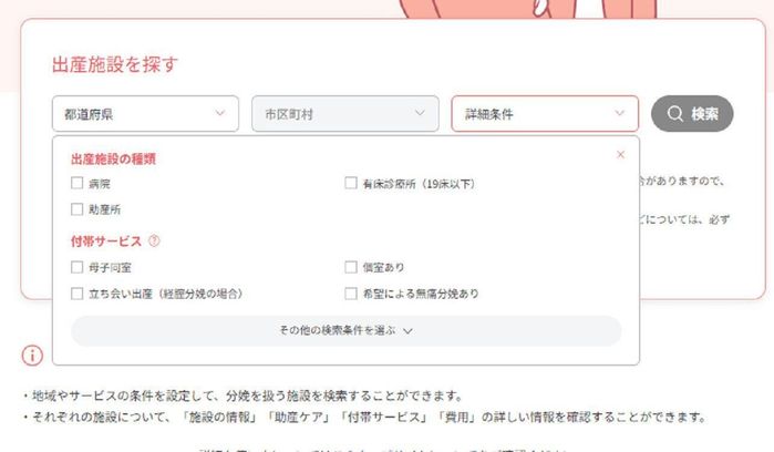 詳細条件の選択項目には、病院か個人産院かといった施設の種類、個室の有無や立ち会い出産、無痛分娩が可能かどうか、授乳支援等のケアの有無などがあります。