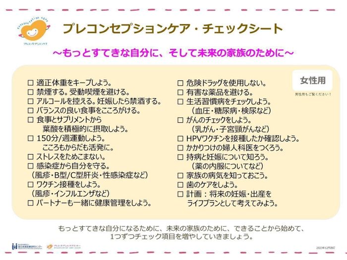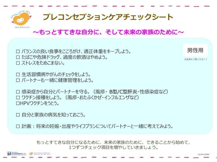 三戸 国立成育医療研究センターで「プレコンセプション・チェックシート」というものを作りましたので、ぜひ利用してください。女性用と男性用があります。