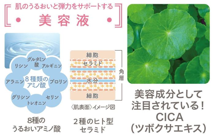8種のうるおいアミノ酸、2種のヒト型セラミド、CICAなど、デリケートな妊娠ボディをたっぷり潤す美容液。